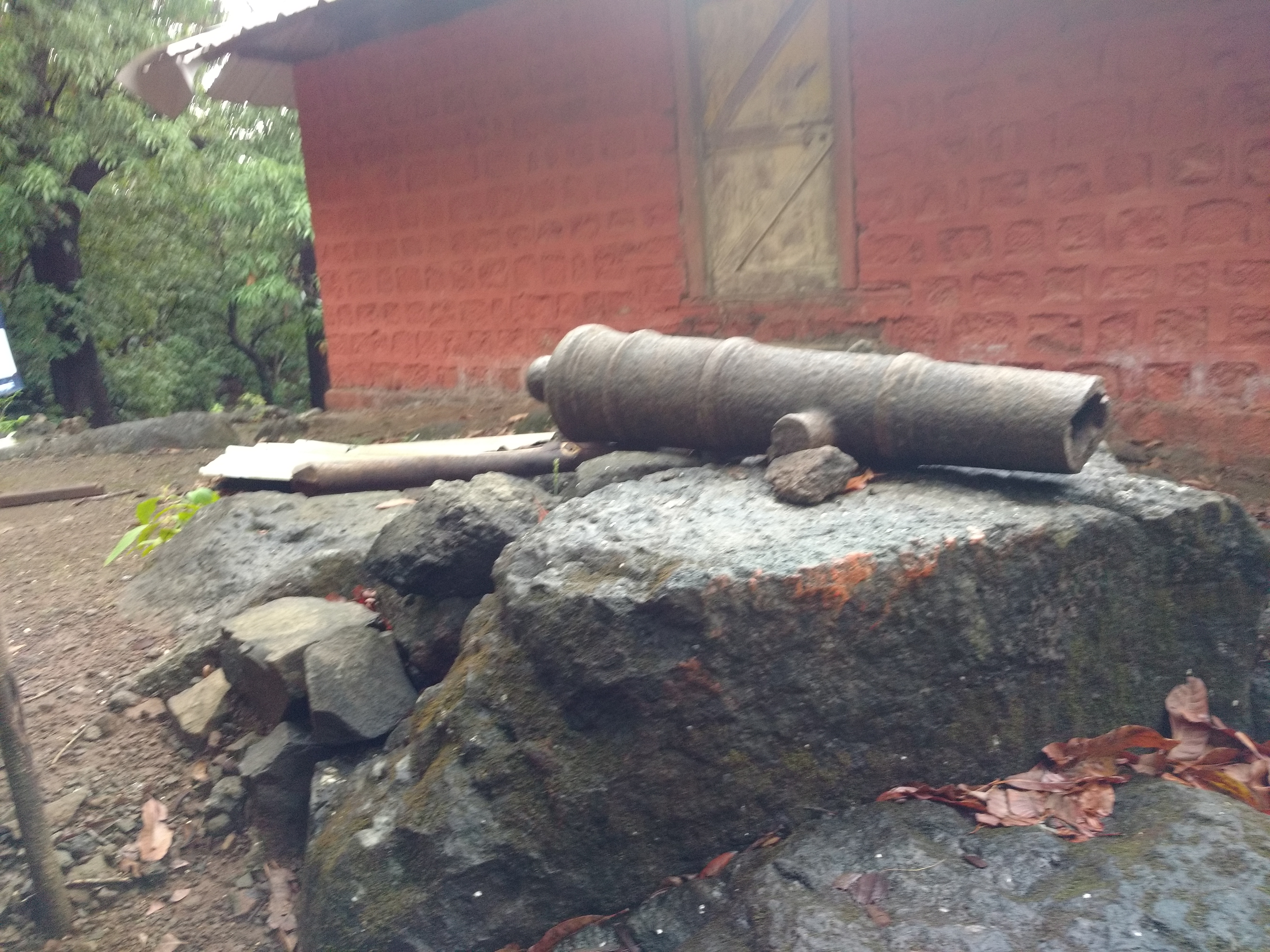 After exploring the fort, we took a different way down and came across a beautiful old door. We walked past it and reached a temple. It had ‘shivlings’ and ‘nandis’ found around the place kept together. There was also a broken ‘tof’ kept ourside the temple.
