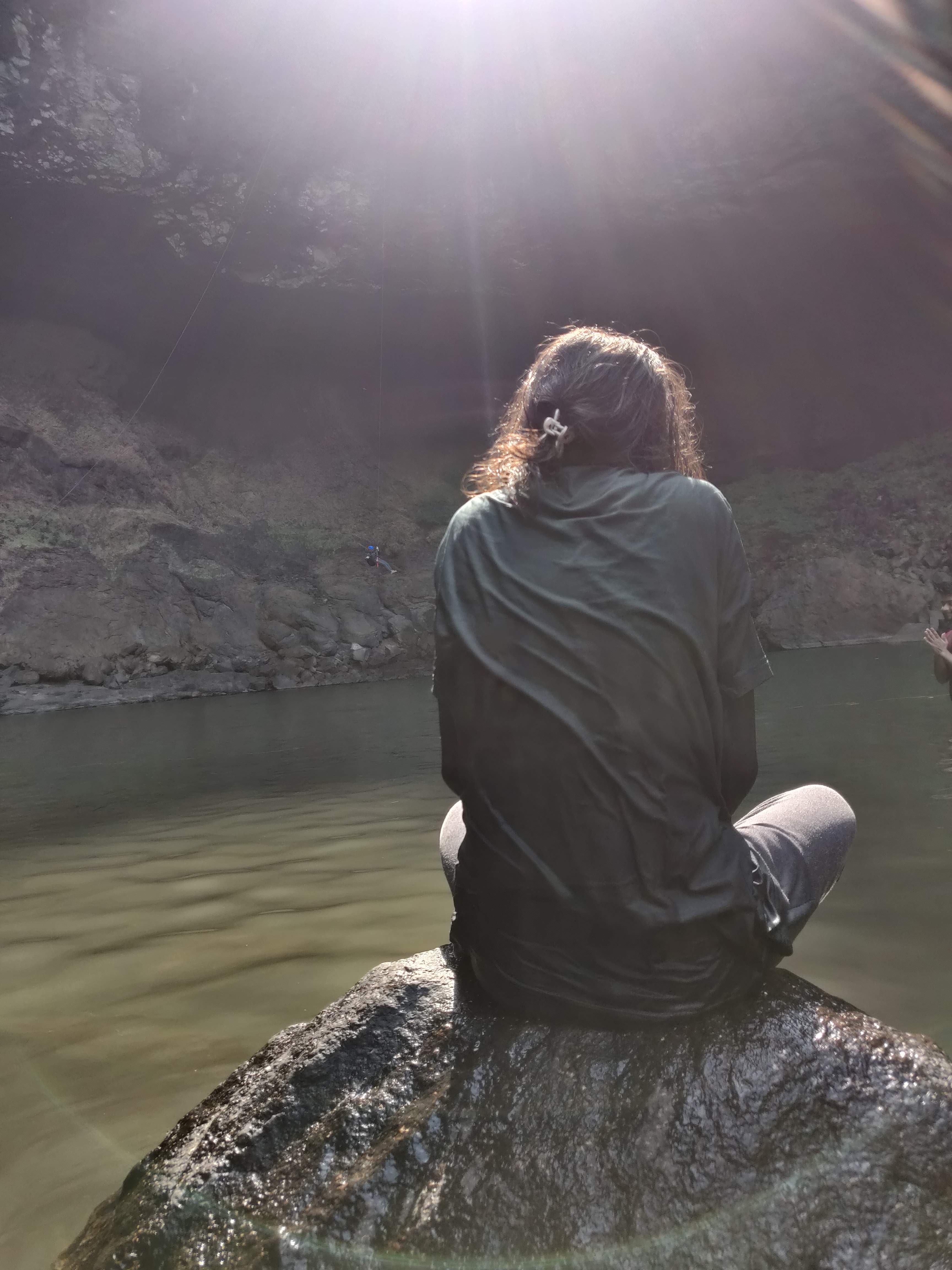 After photo sessions we begin to walk down. I had seen a spot while climbing up near the stream where I had wished to relax. I kept my bag at one place and walked down towards it. I removed my shoes, kept my feet in water and sunk in the moment completely.